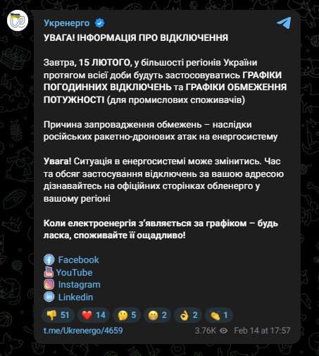 19:21 Завтра в большинстве регионов Украины будут действовать графики отключения света,