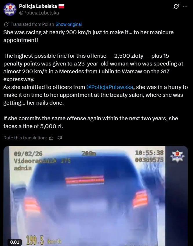 Записи с полицейских видеорегистраторов подтвердили, что девушка ехала на автомобиле Mercedes почти 200 км/ч при установленном на данном участке дороги ограничении скорости 120 км/ч. В официальном заявлении полиции приводится пояснение девушки, которая заявила, что ехала со скоростью 200 км\час из-за того что спешила из Люблина в Варшаву в салон на маникюр.
