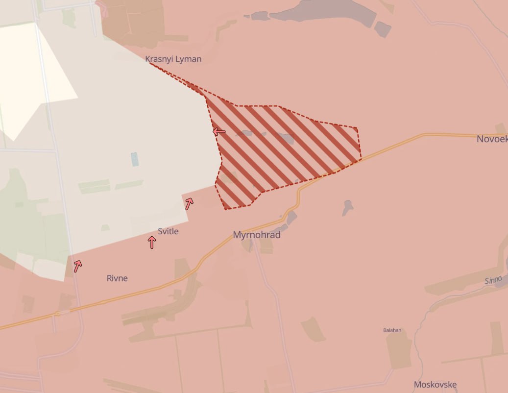 "Закрепление в этом районе позволяет противнику осуществлять накопление для дальнейшего продвижения в глубину перешейка между Покровском и Родинским, что увеличивает риск для остатков группировки Сил обороны на окраинах Мирнограда", – пишет паблик.