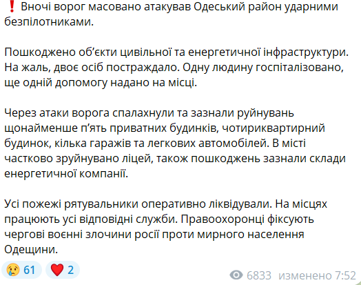 Дроны РФ атаковали Одессу. Повреждена энергетическая и гражданская инфраструктура