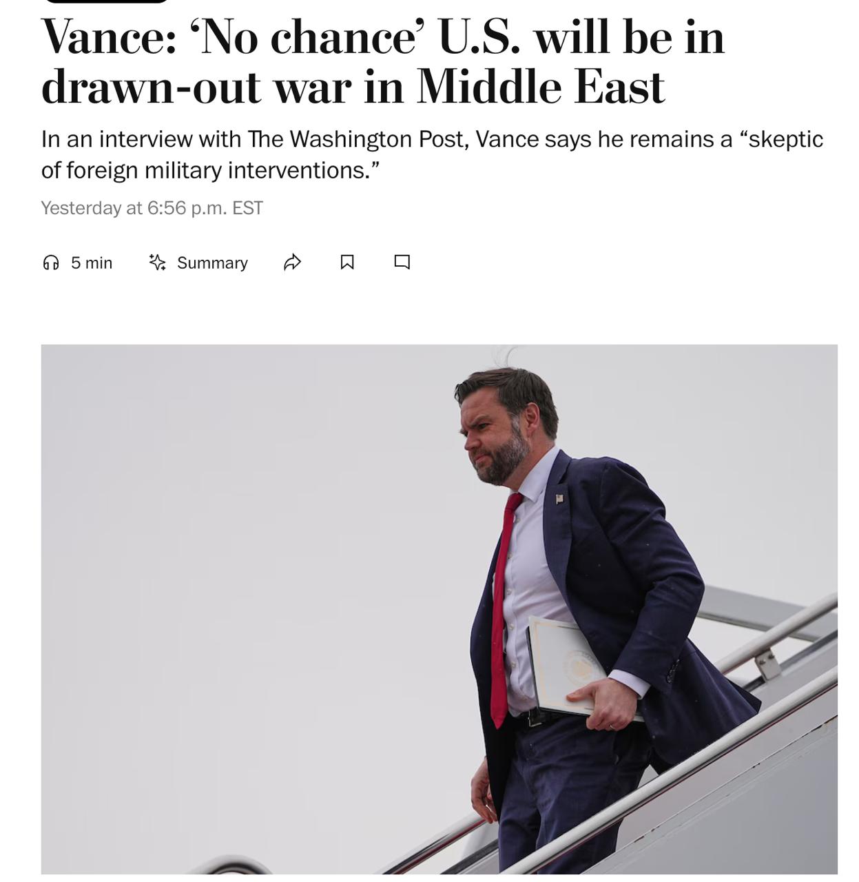 "Идея о том, что мы будем вести ближневосточную войну на протяжении многих лет без конца - нет риска, что это случится", - сказал Вэнс в комментарии The Washington Post.
