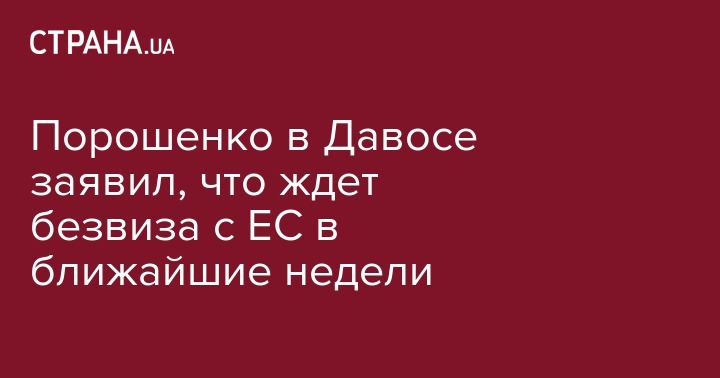 Президент Петр Порошенко, находясь в Давосе, заявил, что Украина ожидает получить безвизовый режим с ЕС в ближайшие недели. Об этом сообщает Reuters.