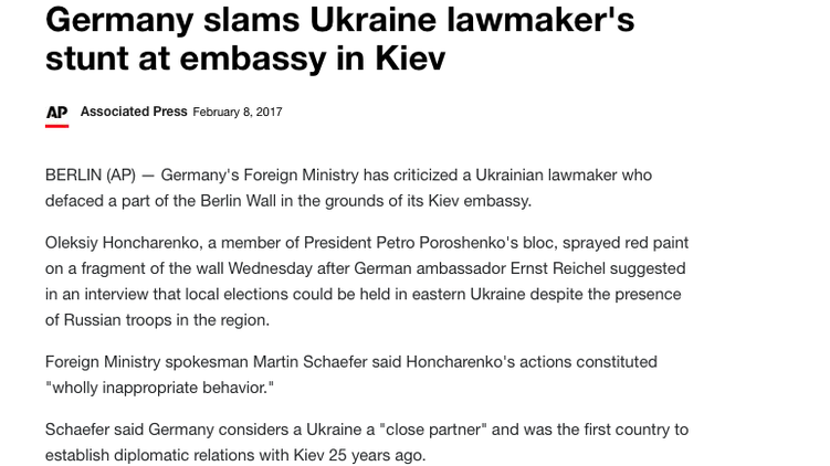 В немецком посольстве осудили инцидент напомнили, что "падение Берлинской стены для всех европейцев символизирует освобождение от коммунизма и советской гегемонии" и выразили сожаление по поводу недостойного поступка украинского нардепа.