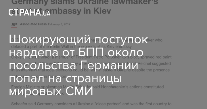 Ряд влиятельных западных СМИ написали об акции народного депутата от БПП Алексея Гончаренко, который сделал баллончиком надпись на фрагменте Берлинской стены у посольства Германии в Киеве.