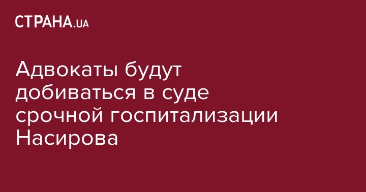 Адвокат отстраненного от должности председателя Государственной фискальной службы Романа Насирова Александр Лысак заявил, что будет просить следственного судью о насущной госпитализации его подзащитного. Об этом он заявил журналистам под зданием суда, передает УНН.