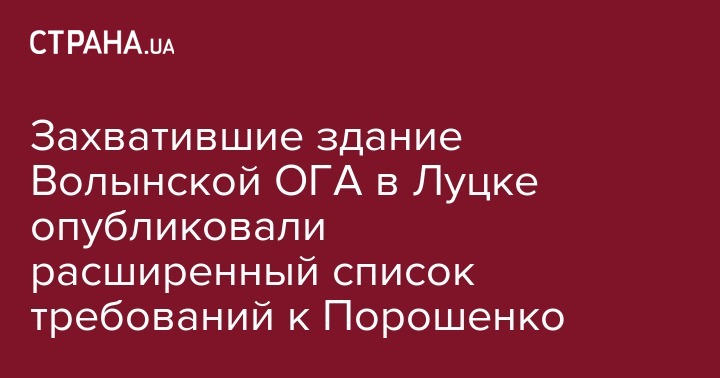 Захватившие здание Волынской ОГА в Луцке сторонники блокады Донбассе огласили расширенные требования к президенту Украину Петру Порошенко, премьер-министру Владимиру Гройсману, генпрокурору Юрию Луценко и главе Верховной Рады Андрею Парубию.