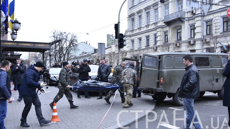 Правоохранители увозят тело убитого депутата Дениса Вороненкова, фото: Страна.ua
