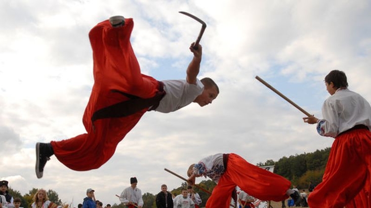 Боевая техника гопака сочетает в себе танцевальную пластику с ударами, блоками, захватами и бросками. А также это работа холодным оружием от крестьянского серпа или двух до двуручного меча.