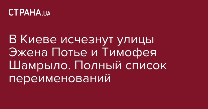 В Киеве исчезнут улицы Эжена Потье и Тимофея Шамрыло. Полный список переименований