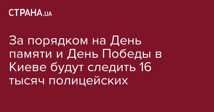 Во время мероприятий ко Дню памяти и Дню победы (8 и 9 мая) правопорядок в Киеве будут обеспечивать около 16 тысяч полицейских, в том числе сотрудники Нацгвардии и Госпогранслужбы.