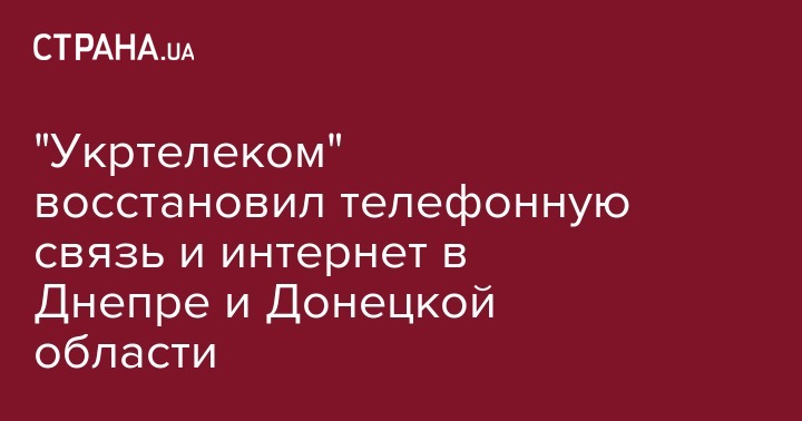 ПАО "Укртелеком" восстановил междугороднюю связь для абонентов Днепра и Днепропетровской области, а также доступ в интернет для абонентов на части подконтрольных Украине территорий Донецкой области, в частности в Мариуполе и Краматорске, сообщает "Интерфакс-Украина" со ссылкой на пресс-службу предприятия.