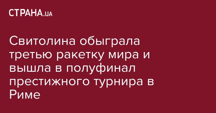 Первая ракетка Украины Элина Свитолина в четвертьфинале престижного турнира Женской теннисной ассоциации (WTA) серии Premier 5 в Риме (Италия) одержала победу над 3-м номером мировой классификации чешкой Каролиной Плишковой и вышла в полуфинал. Об этом сообщает пресс-служба турнира.