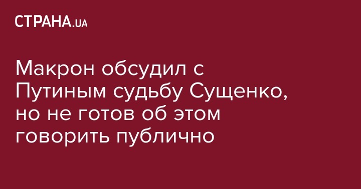 Президент Франции Эммануэль Макрон сообщил, что на встрече с президентом России Владимиром Путиным они затронули тему ареста украинского журналиста Романа Сущенко, который сейчас находится в заключении в Москве. Однако Макрон отказался сообщить подробности и итог переговоров, поскольку это, по его словам, не поможет решению проблемы.