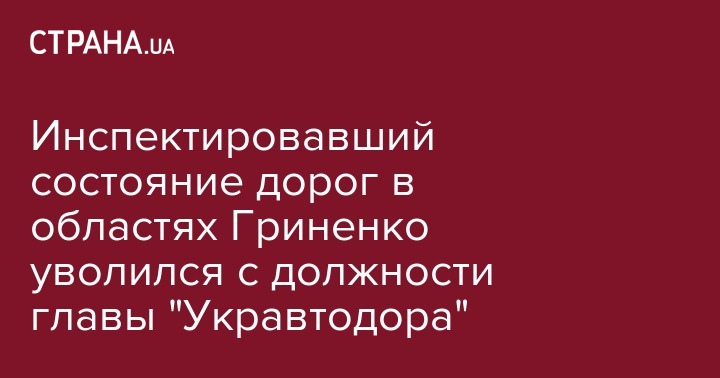 "Исполняющий обязанности председателя правления ГАК "Автомобильные дороги Украины" Артем Гриненко уволен с занимаемой должности по собственному желанию", — говорится в сообщении ведомства.