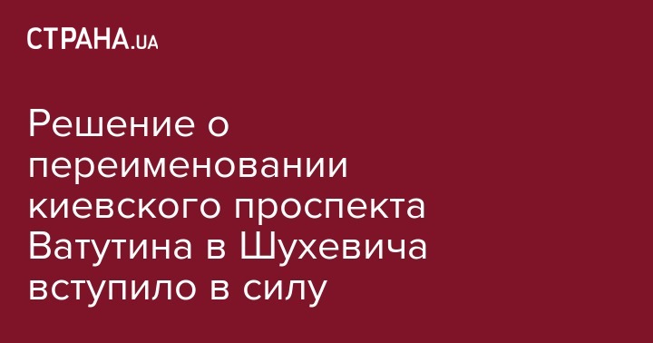 Секретарь Киевского городского совета Владимир Прокопив заявил, что решение Киеврады о переименовании проспекта генерала Ватутина в проспект Романа Шухевича вступило в силу. Об этом сообщают "Украинские Новости".