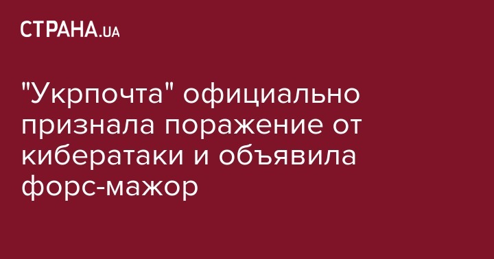 "Укрпочта" опубликовала объявление о наступлении обстоятельств непреодолимой силы (форс-мажор), вызванных кибератакой, что повлияло на способность компании выполнять свои обязательства. Об этом пишет "Интерфакс-Украина".