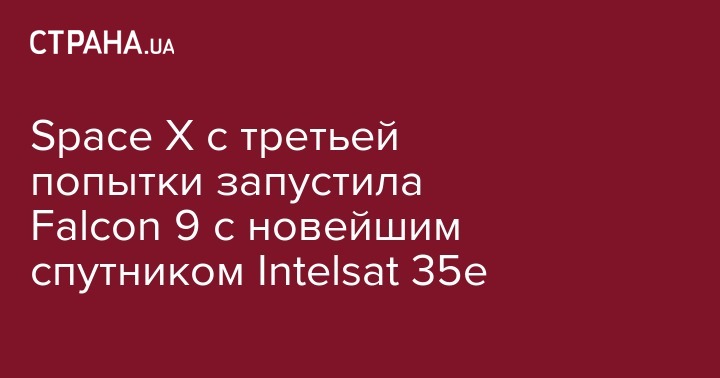 Компания Space X с третьей попытки провела успешный запуск ракеты Falcon 9 и доставила на орбиту новейший спутник Intelsat 35e. Об этом говорится в сообщении компании в Twitter.