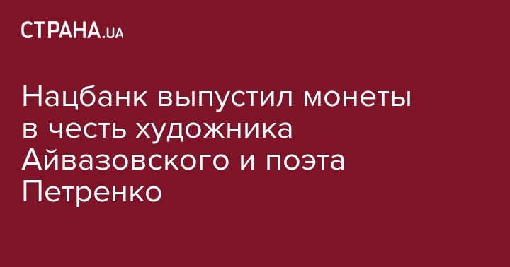 Нацбанк Украины запустил в оборот новые памятные монеты в честь поэта-романтика первой половины XIX века Михаила Петренко и живописца-мариниста и мецената - Ивана Айвазовского. Об этом сообщает пресс-служба НБУ.