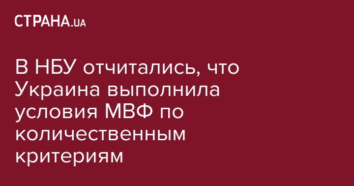 Украина по состоянию на 30 июня выполнила количественные критерии сотрудничества с Международным валютным фондом. Об этом говорится в отчете правления НБУ о проведении денежно-кредитной политики в первом полугодии 2017 года.