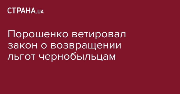 Президент Петр Порошенко наложил вето на принятый Верховной Радой закон, возвращающий чернобыльцам ряд льгот, и вернул его в парламент со своими предложениями. Соответствующая информация опубликована на сайте парламента.