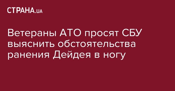 В Киеве организации ветеранов АТО подписали коллективное письмо, в котором требуют от главы СБУ Василия Грицака и военного прокурора Украины Анатолия Матиоса выяснить обстоятельства ранения нардепа от фракции "Народный фронт" Евгений Дейдея. Об этом написал заместитель министра по вопросам временно оккупированных территорий и внутренне перемещенных лиц Георгий Тука на своей странице в Facebook.