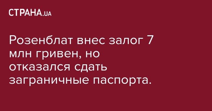 Депутат Верховной Рады Борислав Розенблат (внефракционный) сообщил, что внес залог 7 млн гривен согласно решению суда о мере пресечения, но отказался сдать заграничные паспорта. Об этом он написал на своей странице в Facebook.