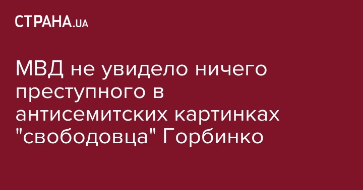 В МВД рассмотрели депутатское обращение Александра Фельдмана по поводу публикации в ФБ антисемитских изображений и высказываний главы Фастовского районного отделения партии "Свобода" Юрия Горбинко. В его действиях признаков уголовного правонарушения не обнаружено. Об этом сообщает директор Украинского еврейского комитета Эдуард Долинский на своей странице в Facebook.