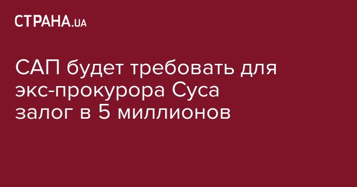Специализированная антикоррупционная прокуратура (САП) будет требовать для экс-прокурора ГПУ Дмитрия Суса меру пресечения с залогом в размере 5 миллионов гривен. Об этом сообщил прокурор САП Сергей Козачина, пишет "Цензор.Нет".