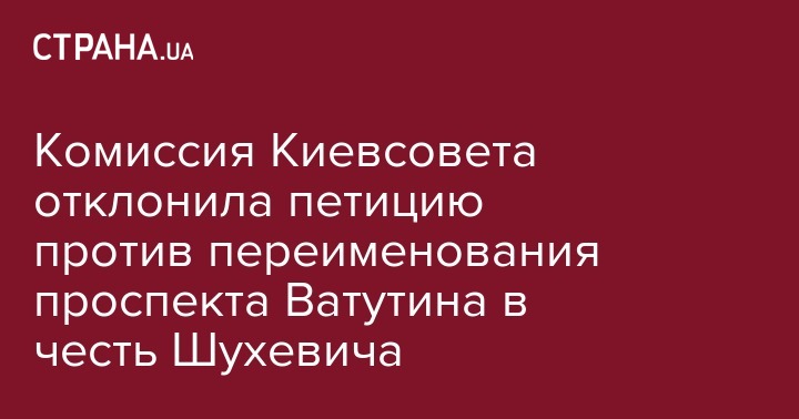 Комиссия по вопросам культуры Киевского городского совета отклонила петицию об отмене переименования проспекта Ватутина в проспект Шухевича в Киеве, заявляет лидер фракции "Свобода" в Киевском городском совете Юрий Сиротюк.