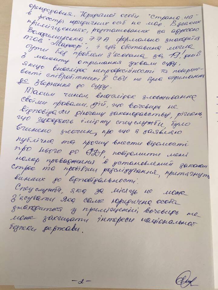 Адвокат "Страны" Елена Лукаш написала претензию СБУ на обыск, проведенный сегодня в офисе нашего издания. Главная претензия к правоохранителям - отсутствие прав на обыск в данном помещении. Ведь по адресу, куда сегодня явились сбушники, находится иное юридическое лицо - ООО Маджери, которое вообще не указано в решении суда.