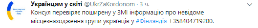 Также в Департаменте консульской службы Украины отмет ли, что проверяюи информацию об исчччезновении группы украинцев в Финляндии.