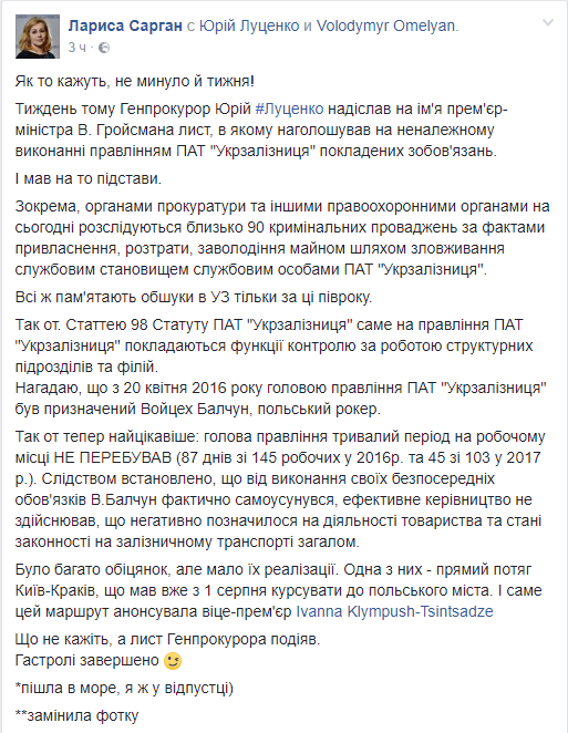 В Генпрокуратуре подтвердили информацию СМИ, что глава ГПУ Юрий Луценко на прошлой неделе направил на имя премьер-министра Владимира Гройсмана письмо, где отмечалась ненадлежащее исполнение тогда еще главой "Укрзализныця" Войехом Балчунов возложенных обязательств, в связи с чем в ГПУ просили контракт с ним не продлевать. Информацию подтвердила в Facebook пресс-секретарь Луценко Лариса Сарган.
