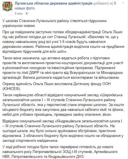 В новом учебном году все школьники 1-5 классов Станично-Луганского района будут учиться на украинском языке. Об этом сообщила зампредседателя Луганской ОГА Ольга Лишик, говорится на странице Луганской ОГА в Facebook.