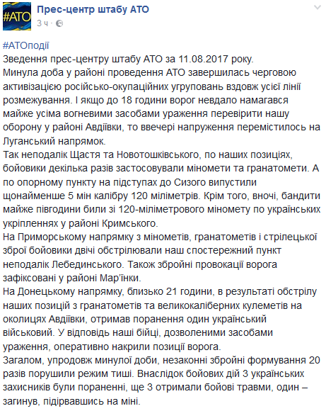 "В целом, за прошедшие сутки, незаконные вооруженные формирования 20 раз нарушили режим тишины. В результате боевых действий 3 украинских защитников были ранены, еще 3 получили боевые травмы, один - погиб, подорвавшись на мине", - сообщили в штабе.