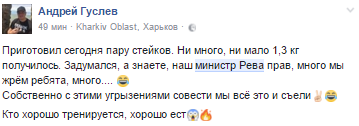 "Приготовил сегодня пару стейков. Ни много, ни мало 1,3 кг получилось. Задумался, а знаете, наш министр Рева прав, много мы жрём ребята, много... Собственно с этими угрызениями совести мы всё это и съели. Кто хорошо тренируется, хорошо ест", - написал он.