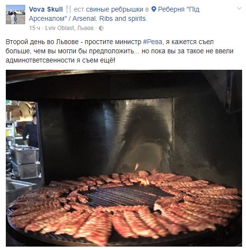Пользователь Vova Skull похвастал перед министром свиными ребрышками из Львова и порадовался, что за их поедание пока не ввели административной ответственности.