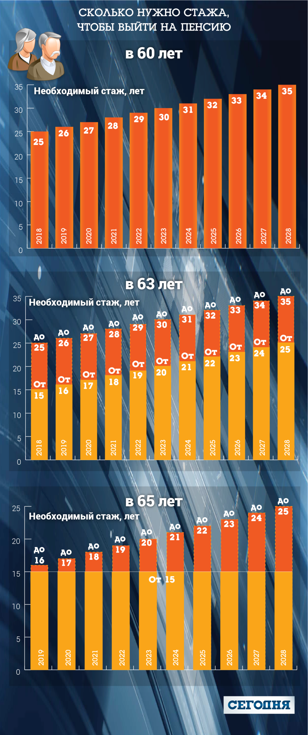 Минимальное требование для получения пенсии в 65 лет не меняется, его закрепили на уровне 15 лет. А вот требования для пенсии в 63 и 60 лет будут расти 10 лет, увеличиваясь с каждым годом на 12 месяцев. Так, в следующем году в 60 лет получить свою пенсию смогут украинцы с 25 годами стажа, а к 2028-му нужно отработать как минимум 35 лет.