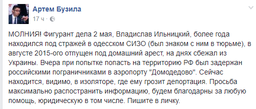 О побеге Ильницкого ранее в Facebook сообщил бывший одесский журналист Артем Бузила, который находится в Москве.