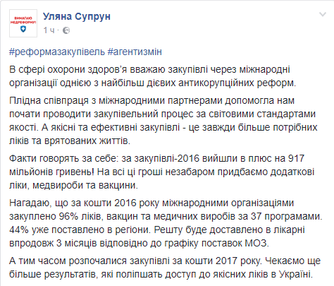 По словам Супрун, деньги, выделенные в 2016 году для закупки медикаментов, шли через международные организации, что позволило сэкономить 917 млн грн - на них, утверждают в Минздраве, будут приобретены дополнительные лекарства, медизделия и вакцины.