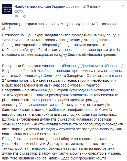 Донецкое управление киберполиции разоблачило преступную группу из пяти человек, которые воровали деньги с банковских счетов онкобольных детей. Об этом сообщает пресс-служба полиции в Facebook.