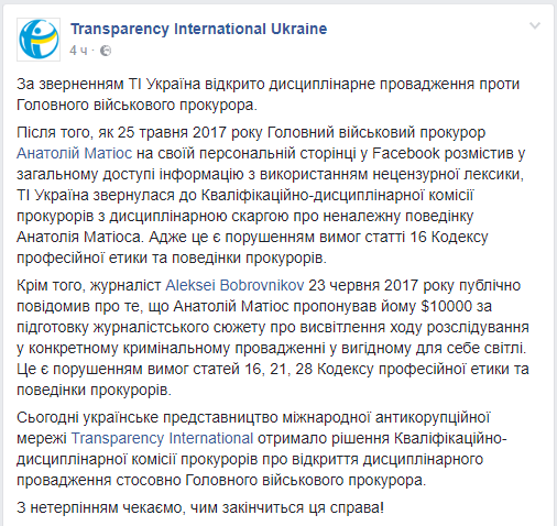 "Сегодня украинское представительство международной антикоррупционной сети Transparency International получило решение квалификационно-дисциплинарной комиссии прокуроров об открытии дисциплинарного производства в отношении главного военного прокурора", - отметили в TI.