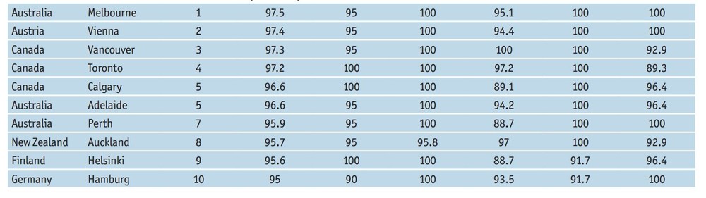 Также в топ-десять попали Калгари (Канада), Аделаида (Австралия), Перт (Австралия), Окленд (Новая Зеландия), Хельсинки (Финляндия) и Гамбург (Германия).