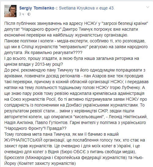 "Господа политики и коллеги - медиа-эксперты, особенно те, кто рассказывал, что мы в Союзе журналистов "неправильно" реагируем на заявления народного депутата. Как правильно реагировать?", - спрашивает Томиенко.
