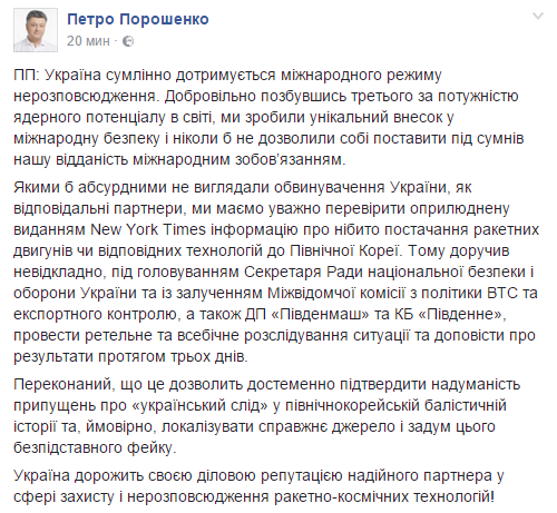 Президент Украины Петр Порошенко поручил расследовать информацию, опубликованную в The New York Times, о поставках из Украины в КНДР ракетных двигателей.