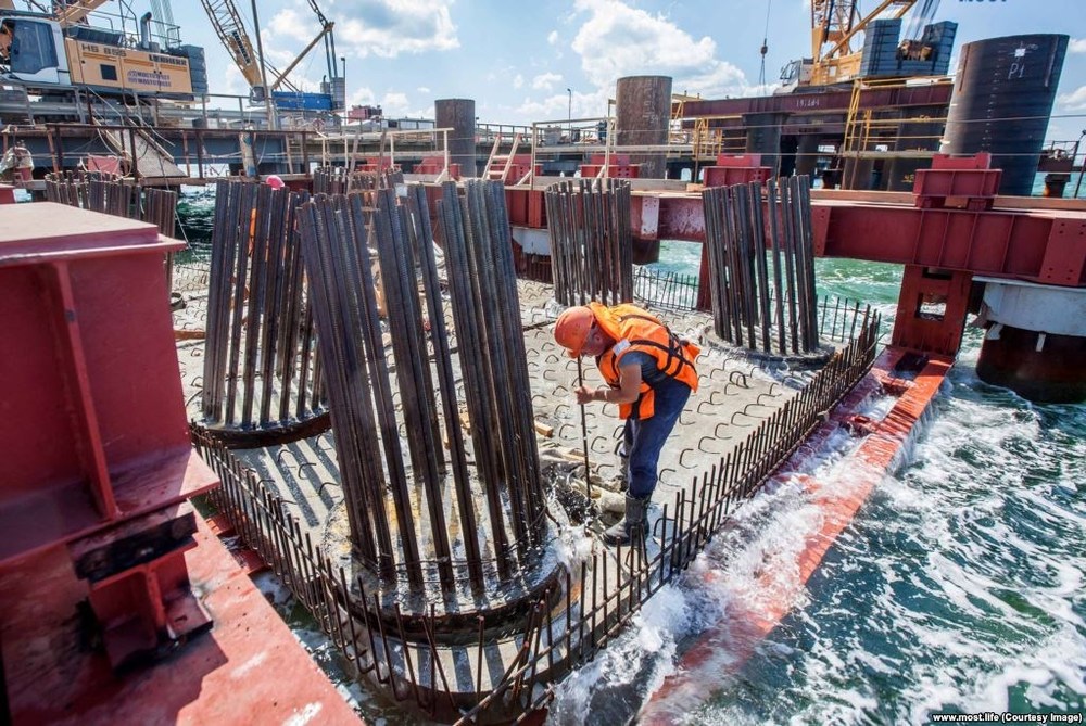 Инженер работает, в то время как волны бьют понтон. Ставки на проект высоки, в него вливается много российских ресурсов. Согласно недавнему докладу New Yorker, "строительство новых автомобильных дорог в России практически приостановлено", а строительство Керченского моста опережает все сроки Фото: ru.krymr.com
