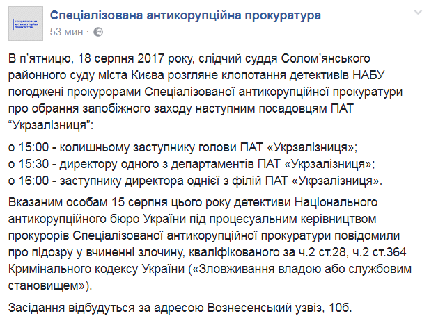 "В пятницу, 18 августа 2017 года, следственный судья Соломенского районного суда города Киева рассмотрит ходатайство детективов НАБУ согласованные прокурорами Специализированной антикоррупционной прокуратуры об избрании меры пресечения следующим должностным лицам ПАО "Укрзализныця":
