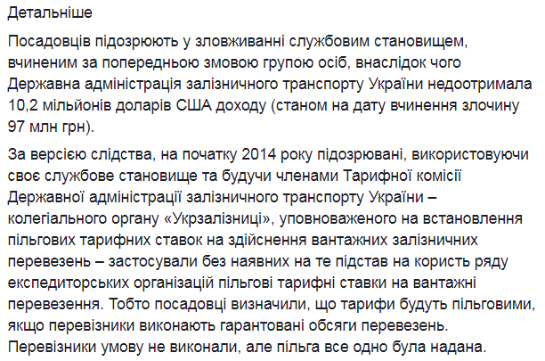 По версии следствия, в начале 2014 года подозреваемые, используя свое служебное положение и являясь членами Тарифной комиссии Государственной администрации железнодорожного транспорта Украины, применили без имеющихся на то оснований в пользу ряда экспедиторских организаций льготные тарифные ставки на грузоперевозки.