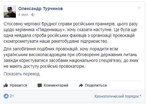 Секретарь Совета национальной безопасности и обороны (СНБО) Украины Александр Турчинов расценивает розыгрыш гендиректора ГП "Южный машиностроительный завод им.Макарова" Сергея Войта российскими пранкерами как попытку скомпрометировать предприятие. Об этом Турчинов написал на своей странице в соцсети Facebook.