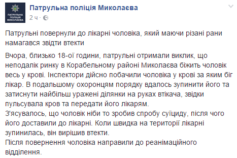 Мужчину, который бежал по городу весь в крови, задержали вчера вечером в Корабельном районе Николаева, сообщает пресс-служба патрульной полиции города.