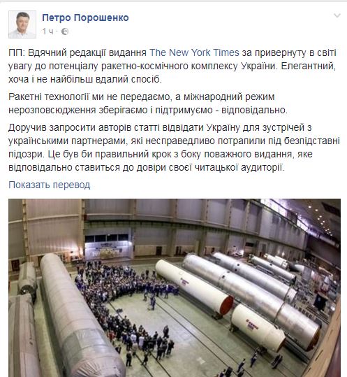 "Благодарен редакции издания The New York Times за привлечение в мире внимания к потенциалу ракетно-космического комплекса Украины. Элегантный, хотя и не самый удачный способ", - заявил Порошенко.